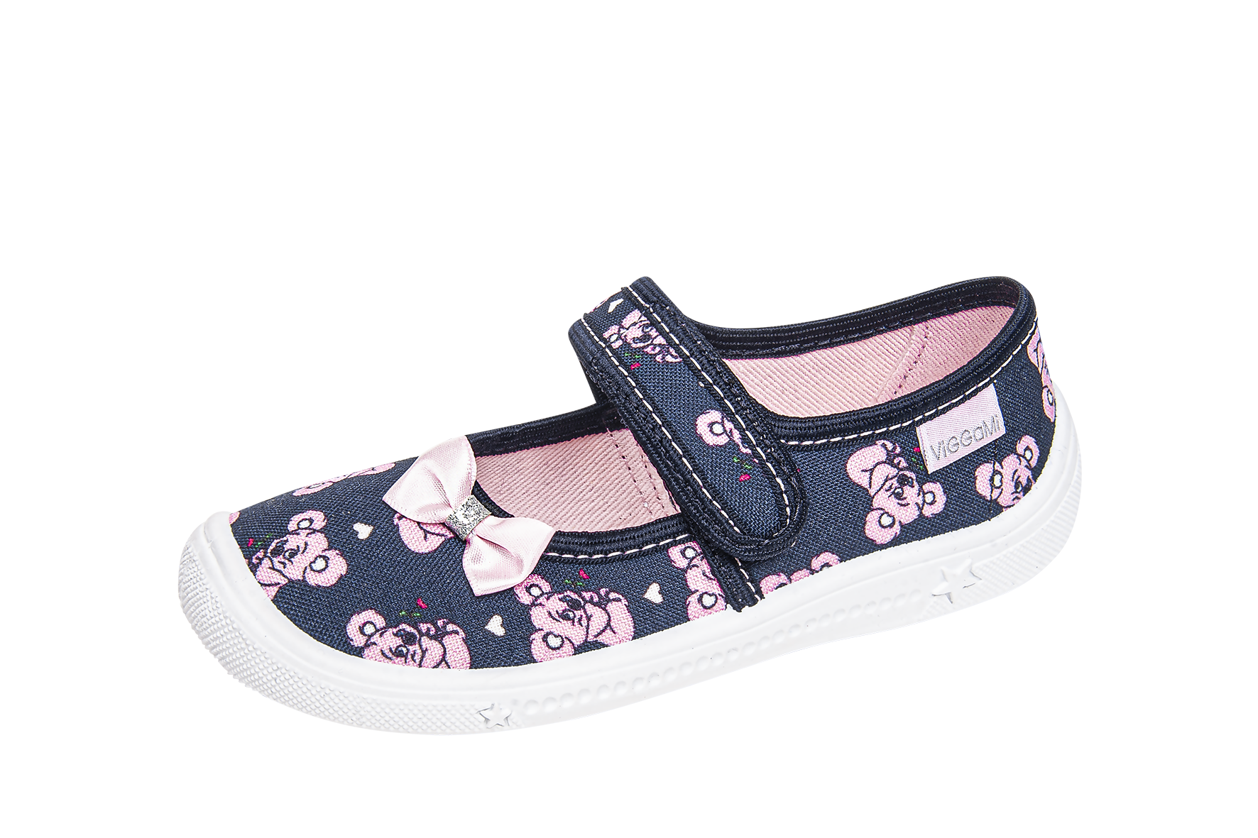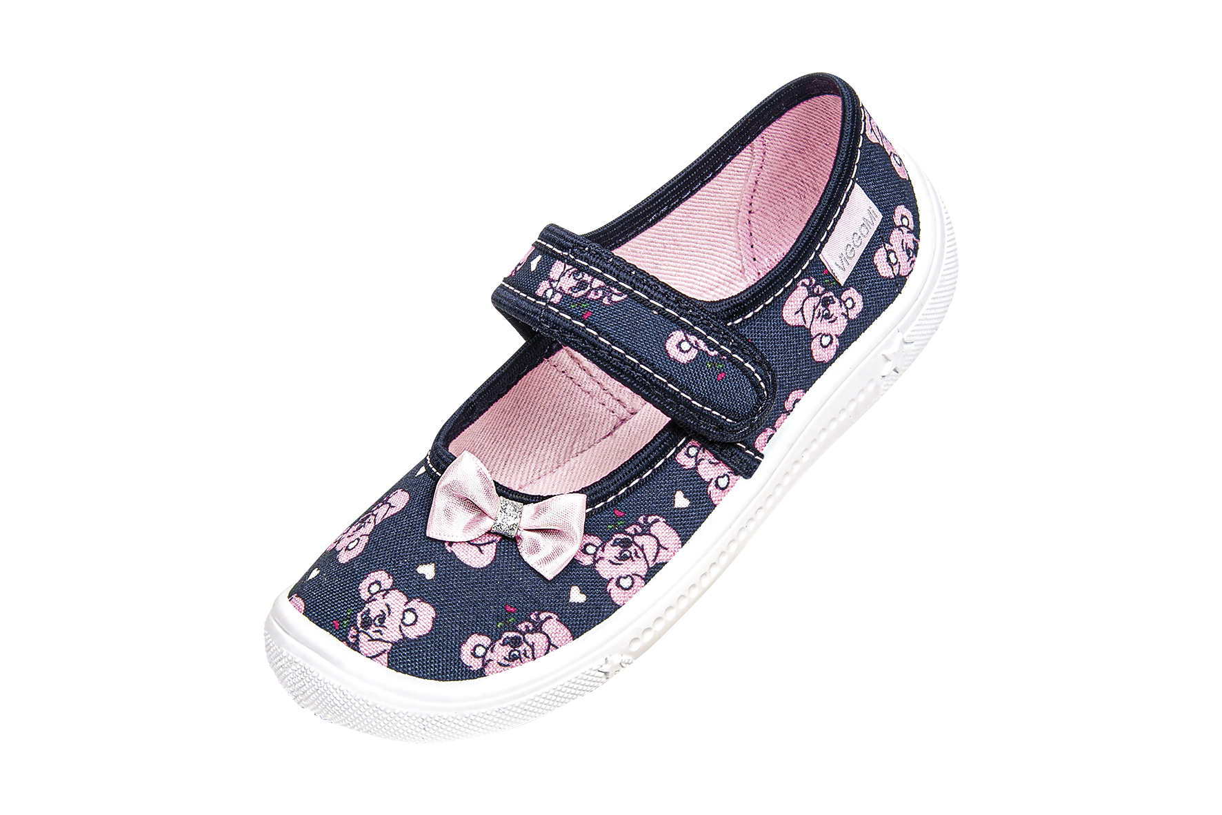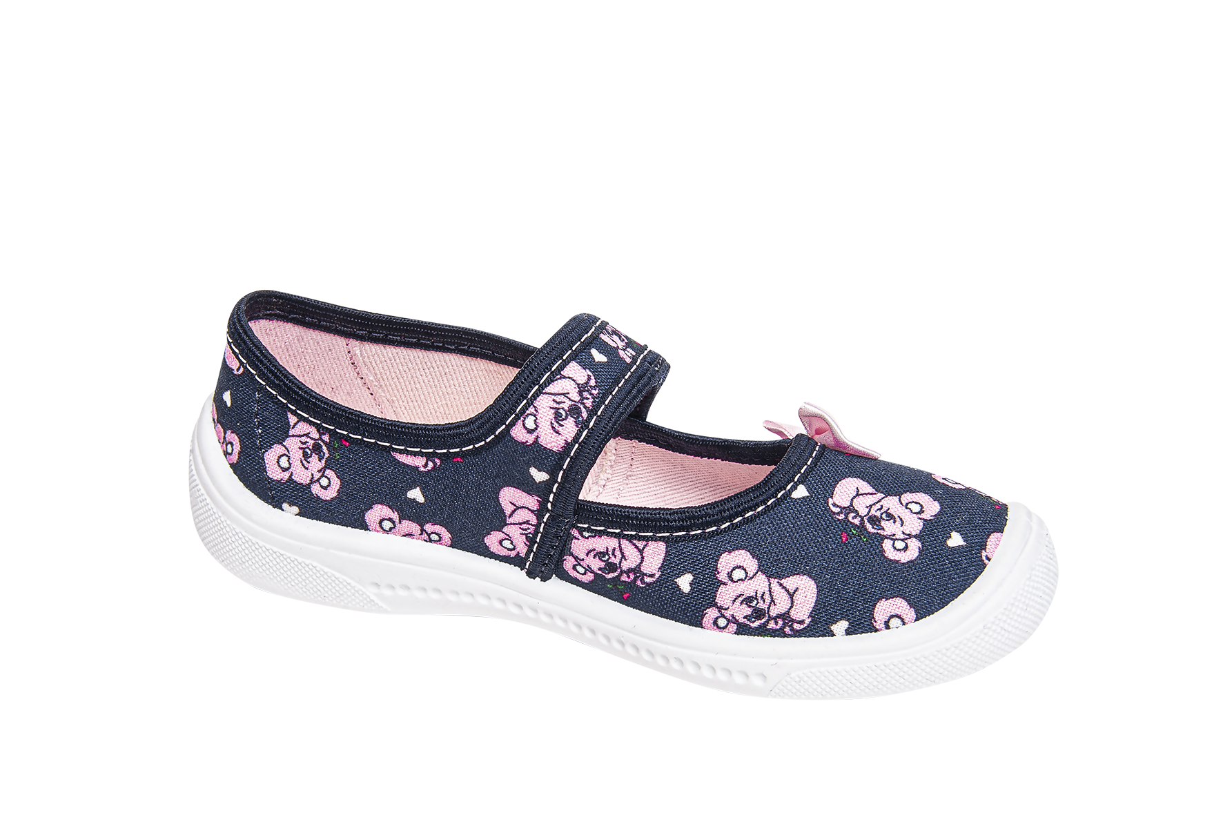 Obuwie tekstylne dla dziewczynki – praktyczne, idealne na spacery, do szkoły i do chodzenia w domu. Wykonane z naturalnej bawełny. Pięta usztywniona termoplastycznym zapiętkiem zapewnia stabilność i bezpieczeństwo podczas chodzenia. Spody obuwnicze są produkowane z lekkiego, odpornego na uszkodzenia i ścieranie tworzywa PVC. Spody są antypoślizgowe. Elastyczne gumki umożliwiają łatwość wkładania stopy.